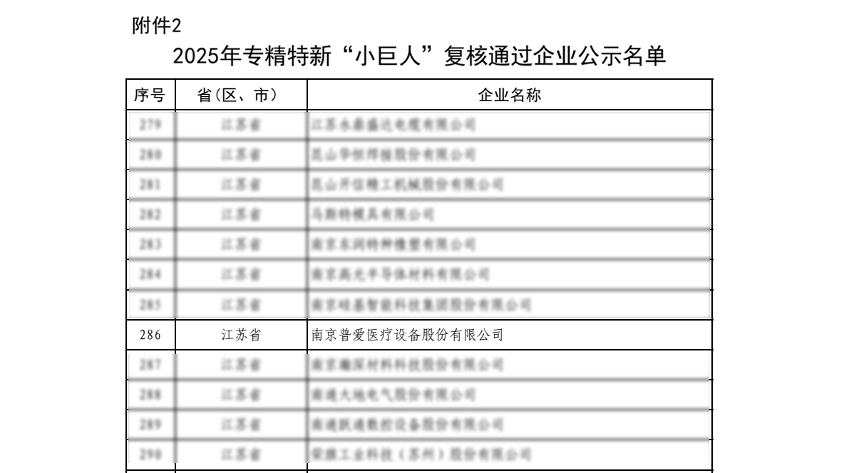 近日,工業(yè)和信息化部2025年專精特新“小巨人”企業(yè)復(fù)核結(jié)果公布,南京普愛醫(yī)療設(shè)備股份有限公司憑借22年深耕醫(yī)學(xué)影像與手術(shù)機(jī)器人設(shè)備領(lǐng)域的技術(shù)積淀和豐碩的自主創(chuàng)新成果,順利通過復(fù)審,持續(xù)保有國家專精特新“小巨人”企業(yè)榮譽(yù)稱號。
